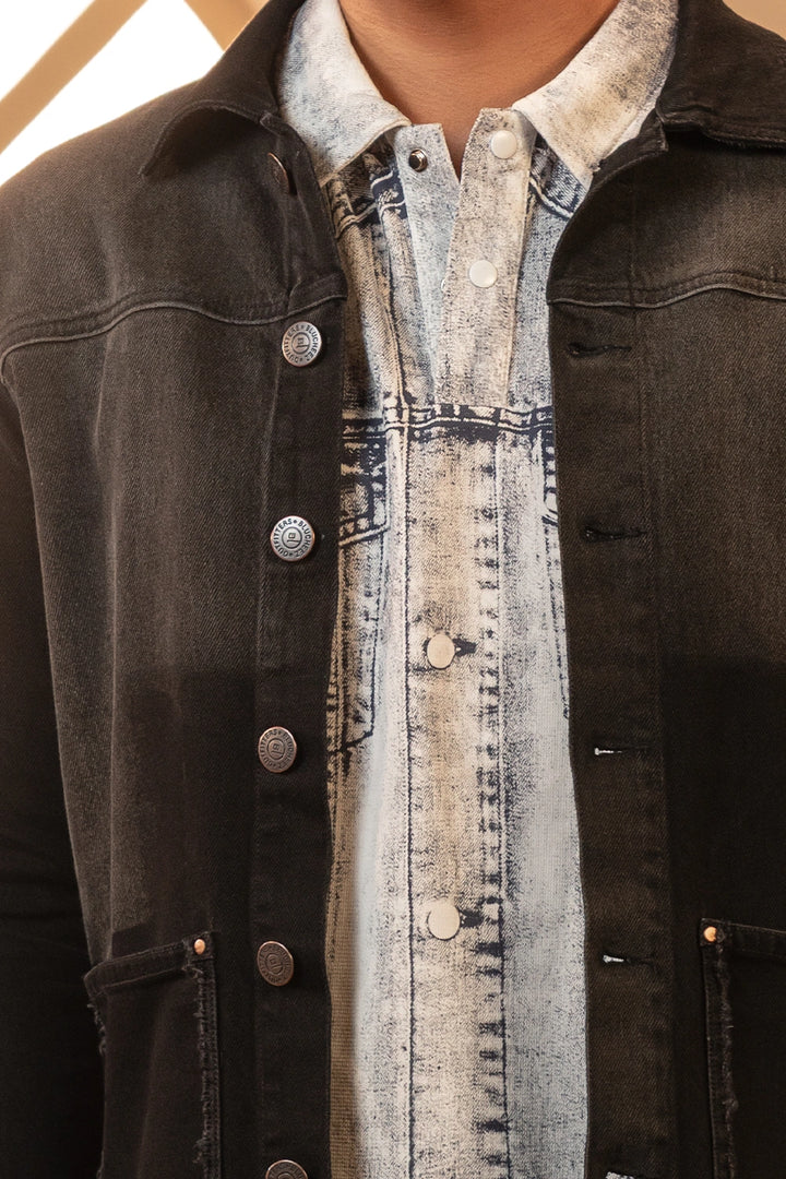 This denim jacket features a modern, two-tone washed finish that creates a striking, layered visual effect. The body is designed with a deep black fade, while the frayed hem adds a rugged, contemporary edge. Front patch pockets with raw detailing and metal shank buttons contribute to its structured, utilitarian character. The silhouette is clean and tailored, allowing it to pair easily with casual or streetwear looks. Styled over a contrasting bleached denim shirt in the image, the jacket showcases its versatility and ability to elevate layered outfits with minimal effort.