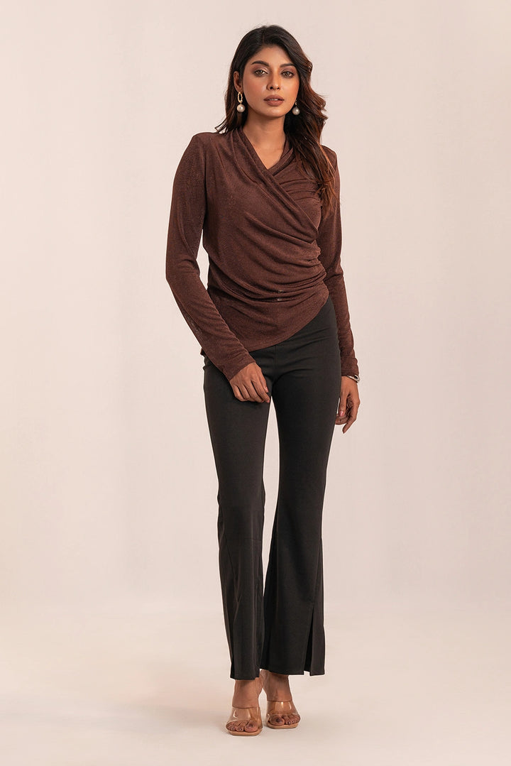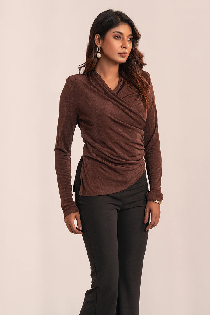 The Cross-Over Top delivers a refined, modern silhouette with its wrapped neckline, soft draping, and streamlined fit. Crafted from premium blended fabric, it offers a smooth feel, excellent stretch, and long-lasting shape retention. The asymmetrical hem and full sleeves create a flattering profile suitable for both casual and elevated looks. Ideal for pairing with tailored pants, denim, or skirts, this versatile top transitions seamlessly from day to evening.