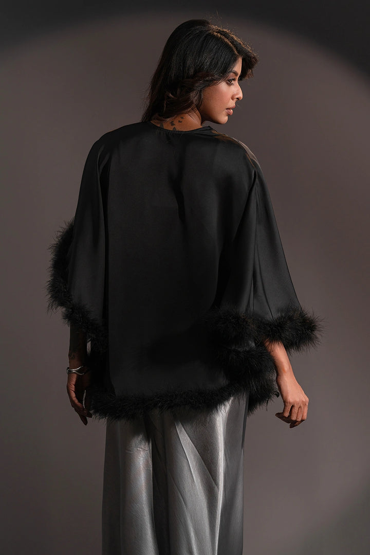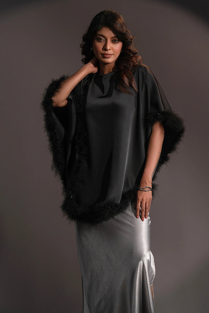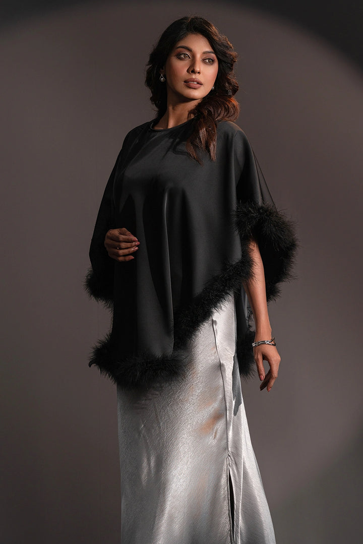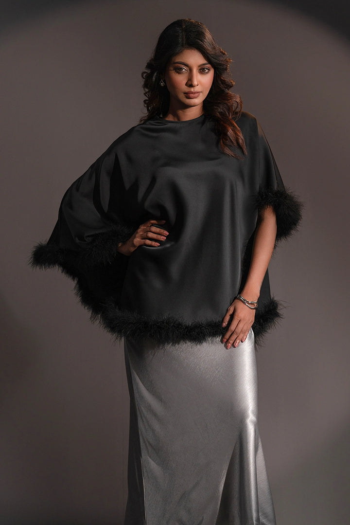 Elevate your evening look with the Luxe Feather-Trim Cape, crafted from premium blended fabric for a smooth, elegant drape. This statement piece features a flowing silhouette detailed with luxurious feather trims along the edges, adding a touch of drama and sophistication. Perfect for festive nights, special occasions, or winter soirées, it pairs effortlessly with dresses, skirts, or tailored trousers.