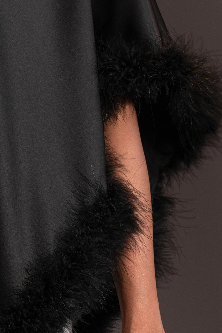 Elevate your evening look with the Luxe Feather-Trim Cape, crafted from premium blended fabric for a smooth, elegant drape. This statement piece features a flowing silhouette detailed with luxurious feather trims...
