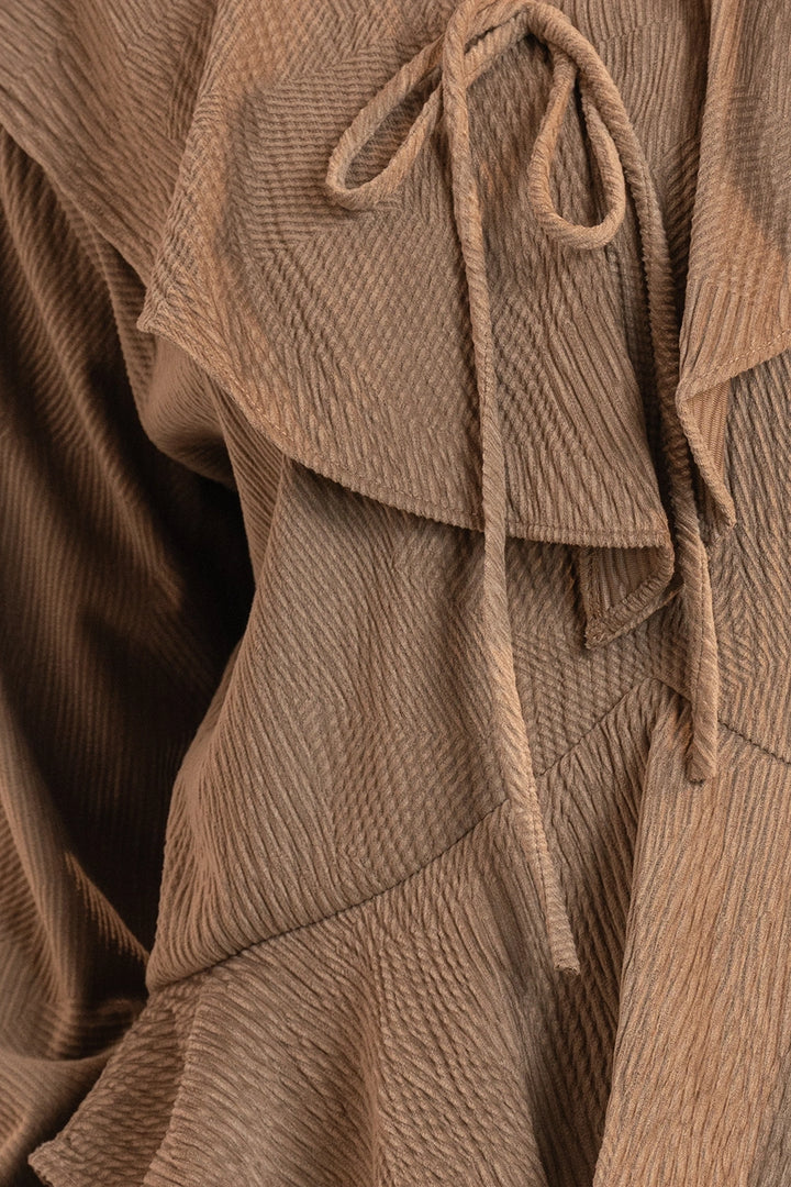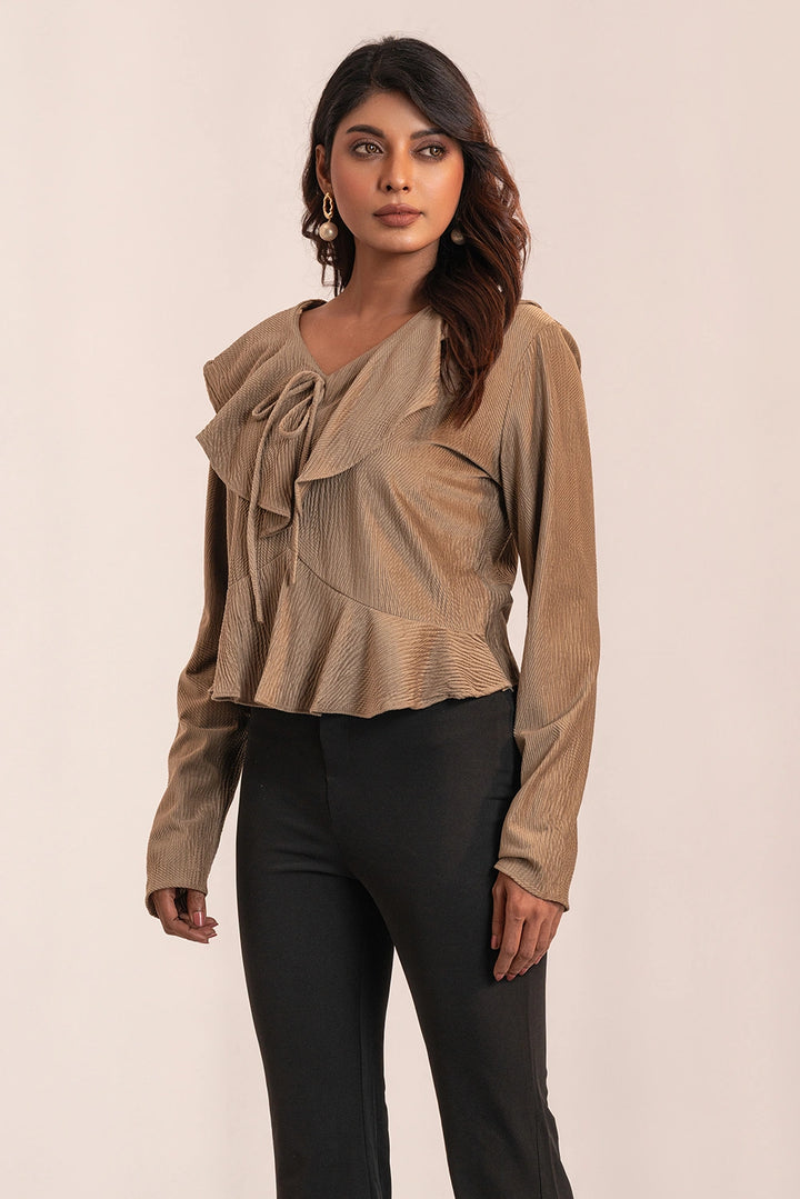 Inspired by timeless elegance, the Victorian Ruffle Top brings a touch of vintage sophistication to modern style. Crafted from premium blended fabric, it offers a soft, textured finish that feels as luxurious as it looks. The delicate ruffle detailing along the neckline and hem creates a graceful silhouette, while the tie-front bow adds a feminine charm.