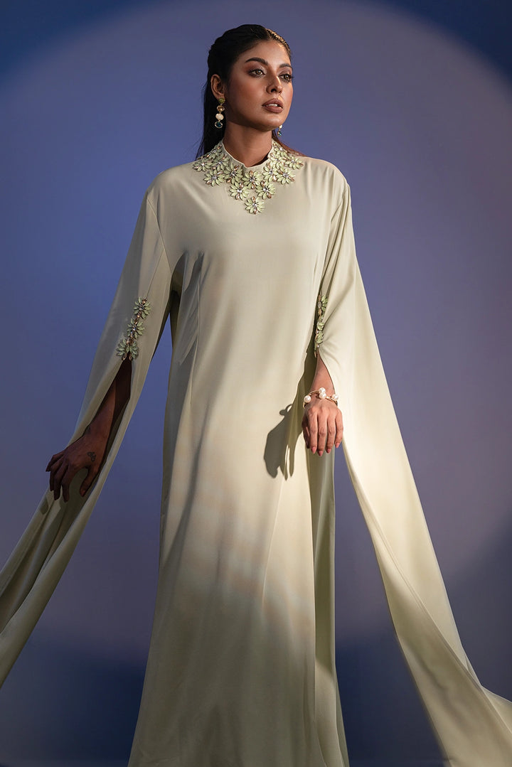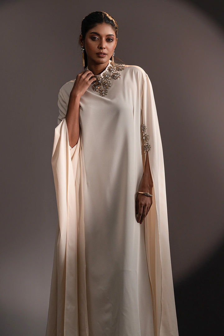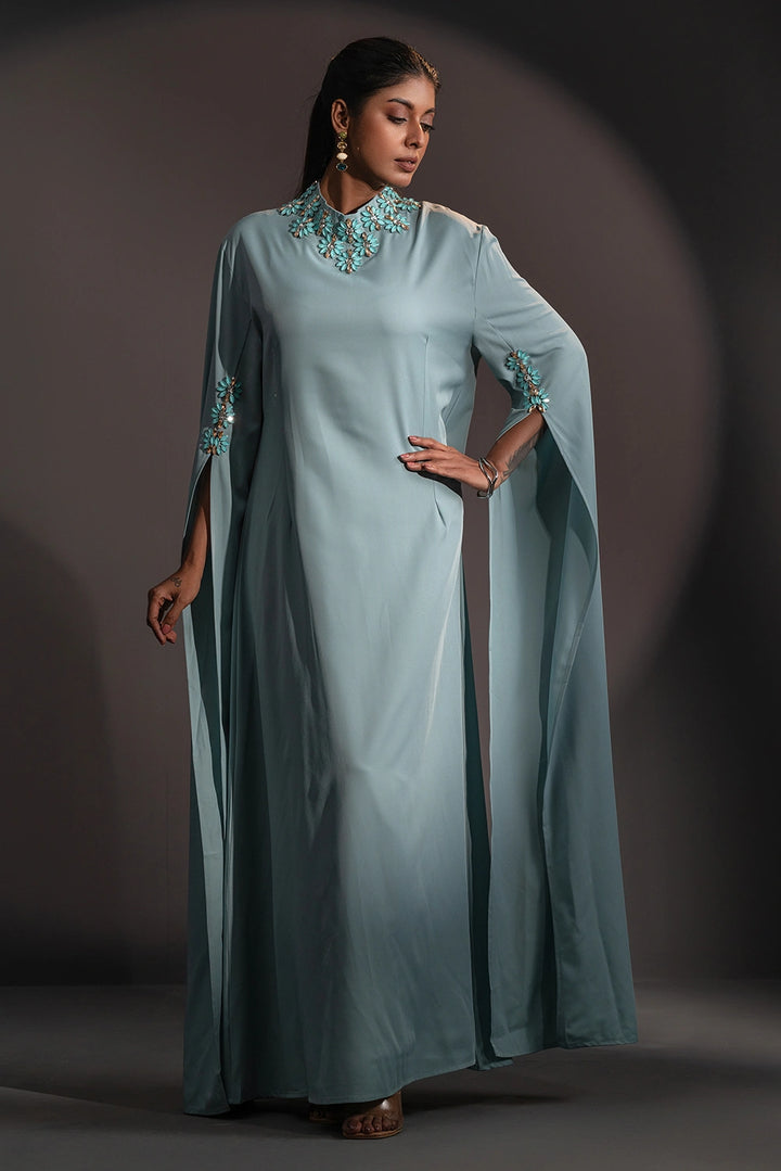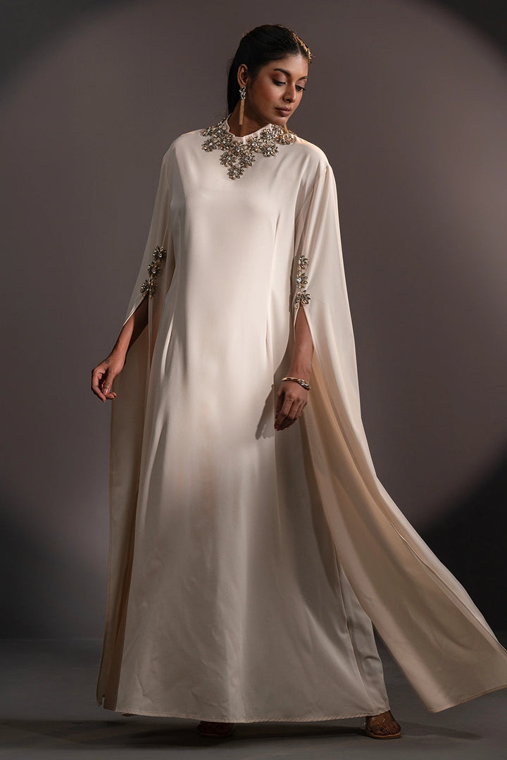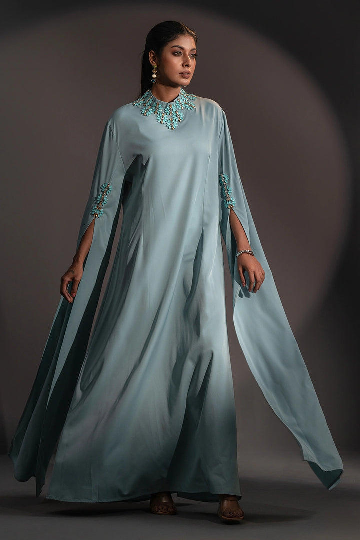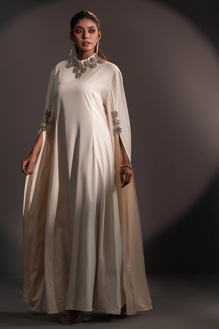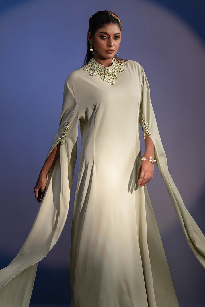 The high neckline is adorned with intricate floral embellishments, beautifully complemented by delicate detailing on the sleeves. Flowing, cape-inspired panels extend from the arms, creating a striking winged silhouette that embodies poise and power.