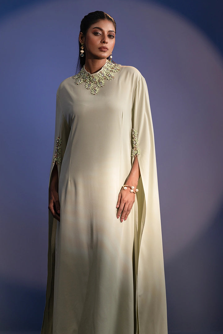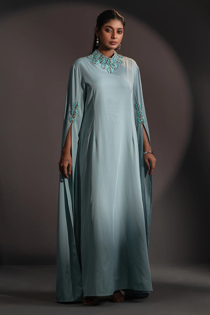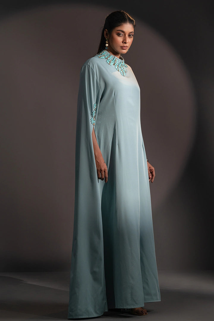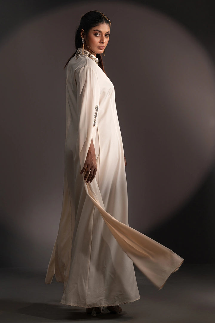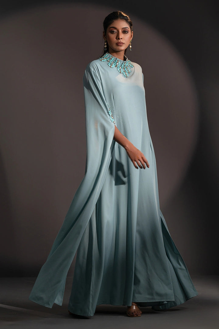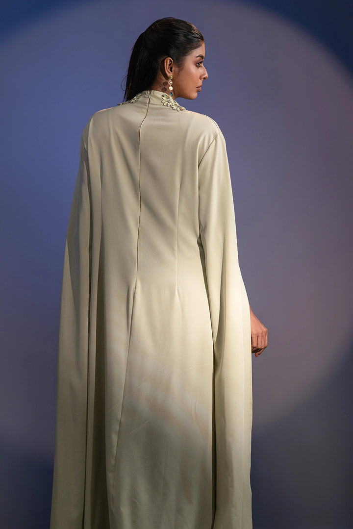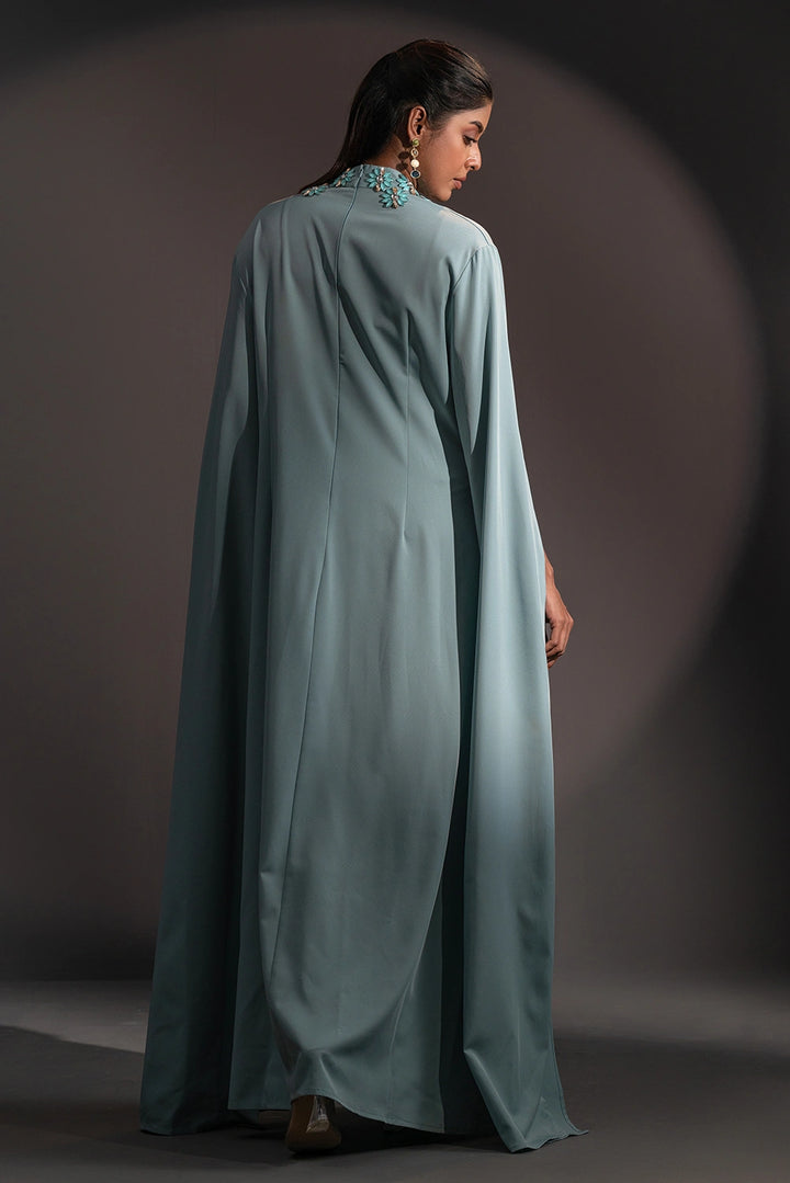 The high neckline is adorned with intricate floral embellishments, beautifully complemented by delicate detailing on the sleeves. Flowing, cape-inspired panels extend from the arms, creating a striking winged silhouette that embodies poise and power.