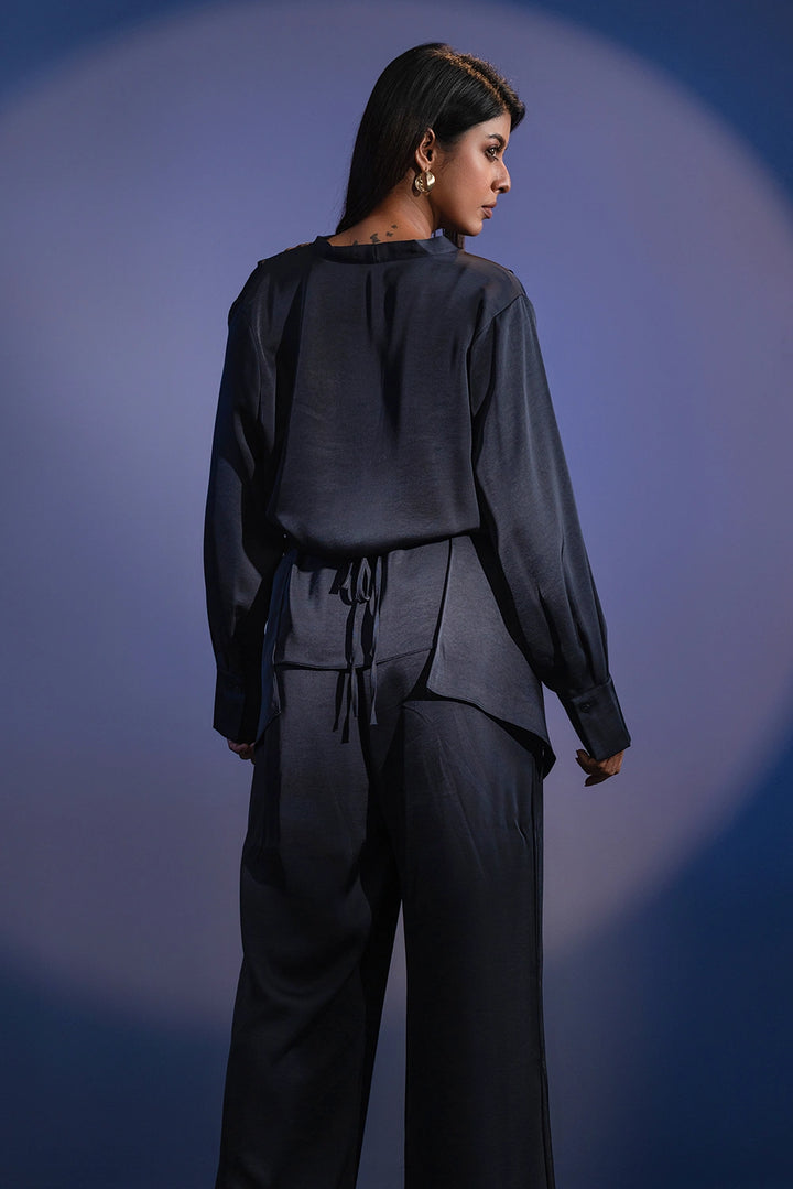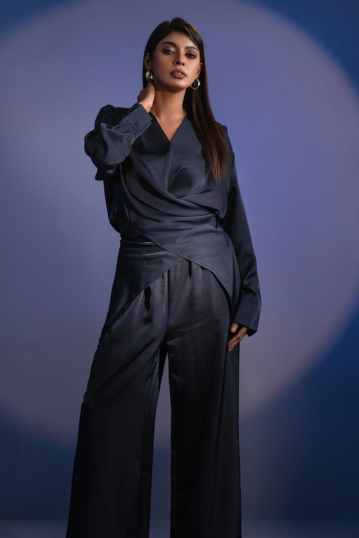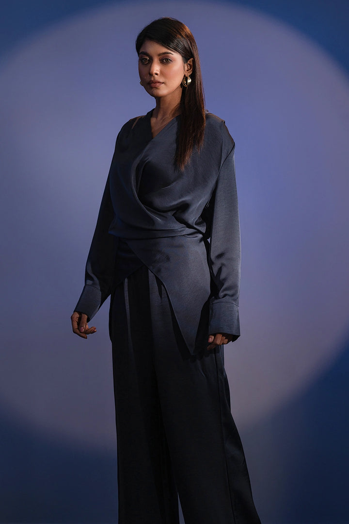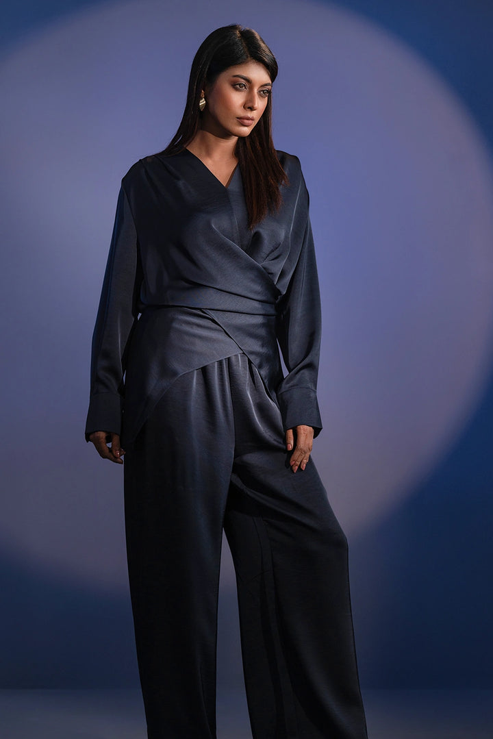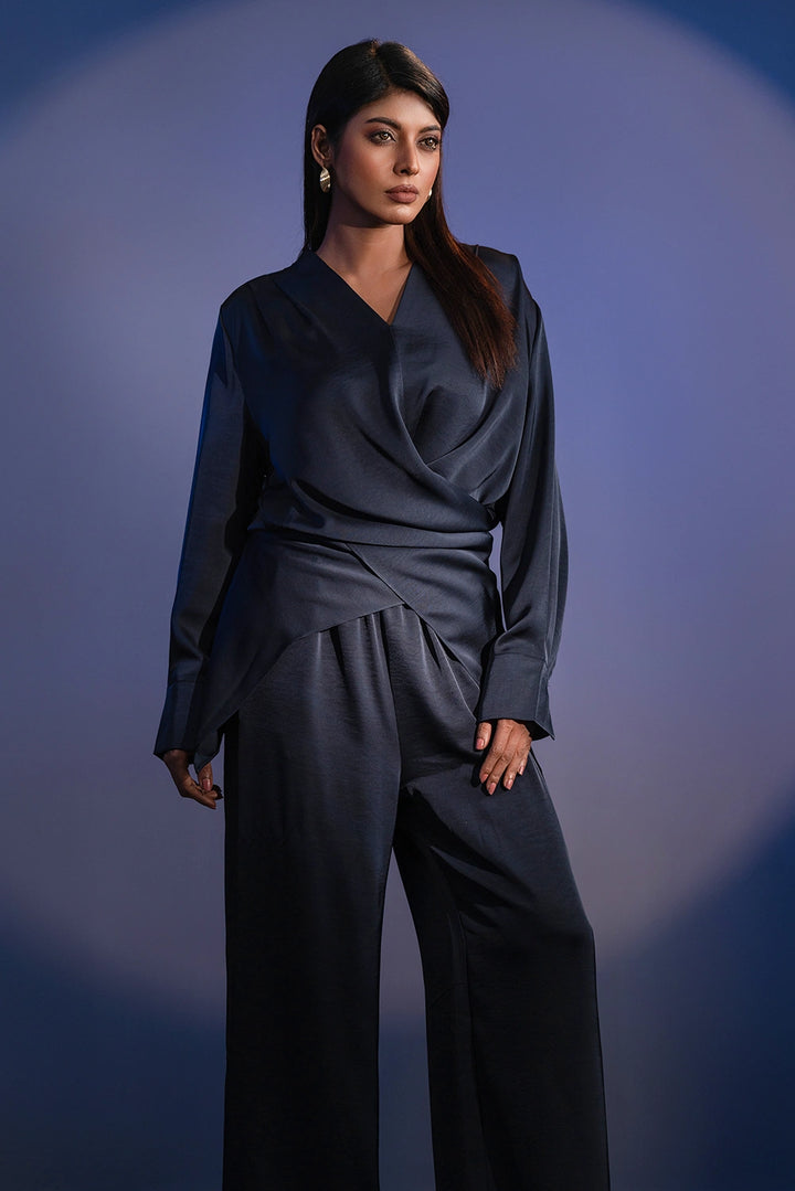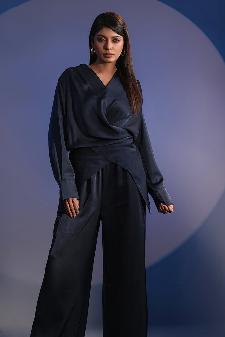Refined. Fluid. Contemporary. The Crossover Set redefines modern elegance with its premium blended fabric — soft to the touch and effortlessly graceful in movement. The draped top features a crossover silhouette with subtle pleating and elongated cuffs for a structured yet relaxed appeal. Paired with wide-leg trousers, this coordinated set offers a balance of sophistication and comfort.