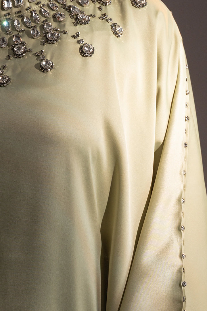 The silhouette flows effortlessly, creating a sense of movement and poise, while the hand-embellished crystal neckline adds a touch of radiant opulence. The delicately detailed sleeves further elevate its elegance, making it an impeccable choice for evening gatherings, festive occasions, or refined celebrations.