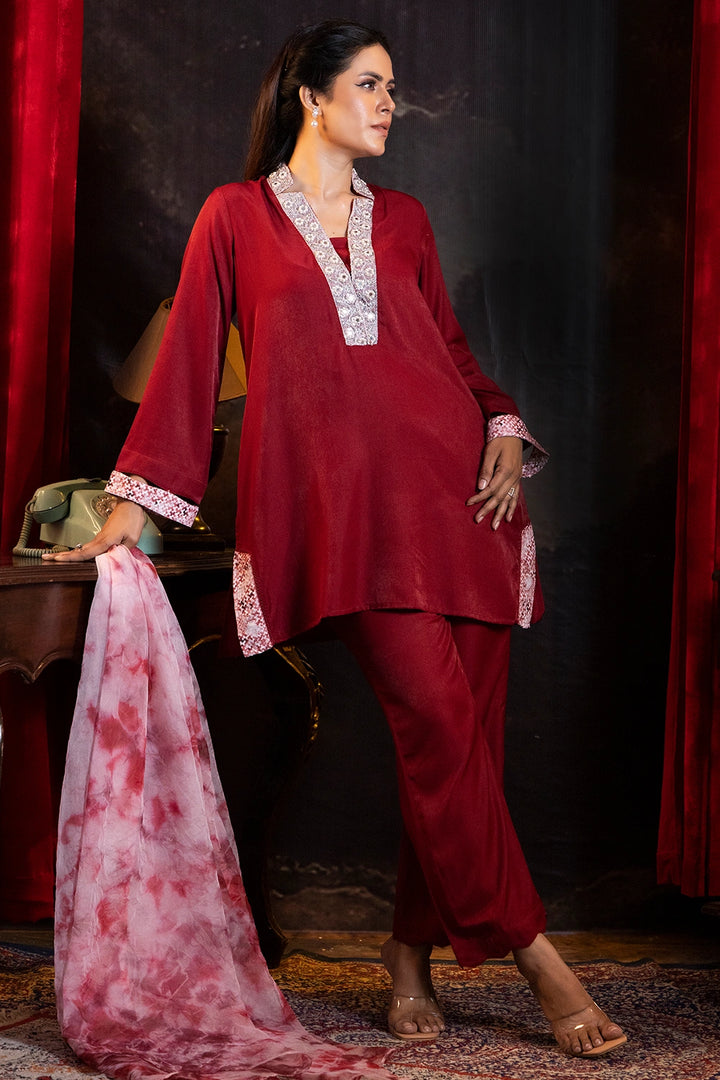 An elegant maroon ensemble featuring a mirror-embellished neckline that adds just the right touch of sparkle. The contrast digital print on the sleeves and side slits brings depth and vibrance, while the scalloped sleeve detailing lends a modern twist. Paired with a matching printed tie-dye dupatta, this versatile piece is perfect for both festive celebrations and semi-formal gatherings.