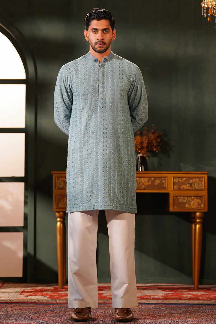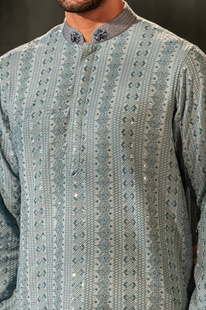 Redefine traditional style with this trendy men’s short Panjabi, crafted from a premium blended fabric that ensures both comfort and elegance. Designed with a Mandarin wide collar, it features intricate all-over embroidered threading highlighted by subtle sequin work, creating a refined shimmer effect.