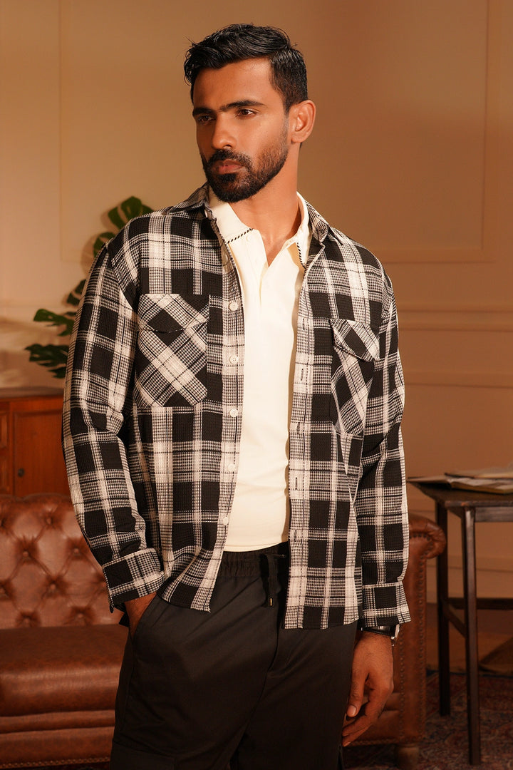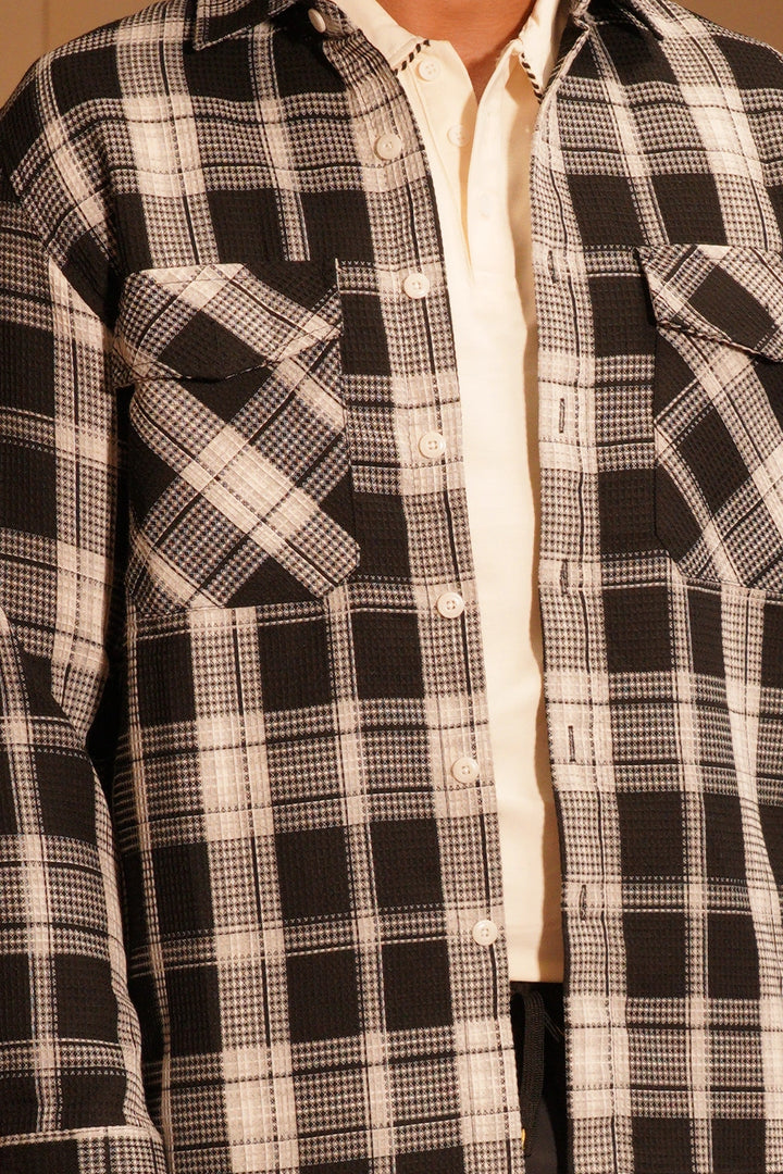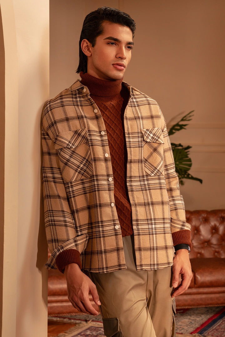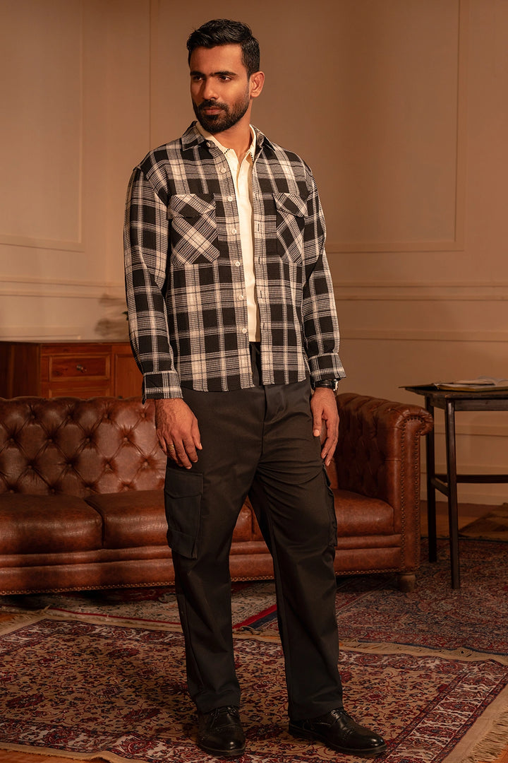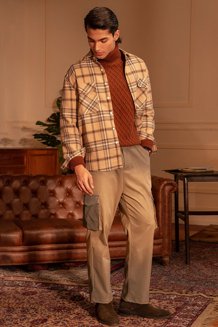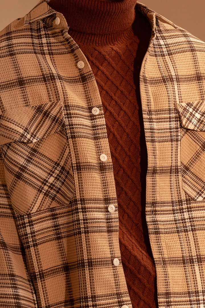 The plaid check pattern in neutral tones makes it effortlessly versatile — perfect for layering over a turtleneck or pairing with chinos for a refined casual look. With its straight hem, buttoned cuffs, and breathable construction, this overshirt ensures all-day comfort and easy wearability.