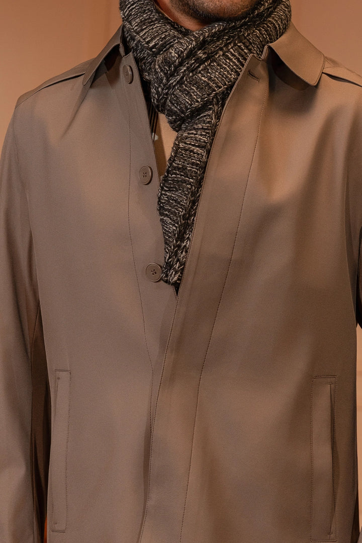 Styled here with neutral trousers and a textured scarf, it’s a versatile piece that transitions seamlessly from day to evening. Whether you’re heading to work or an evening engagement, this trench coat adds that understated touch of class to every ensemble.