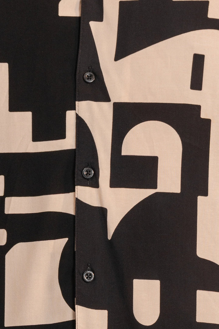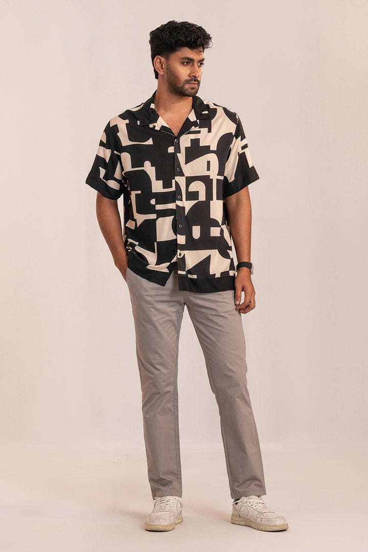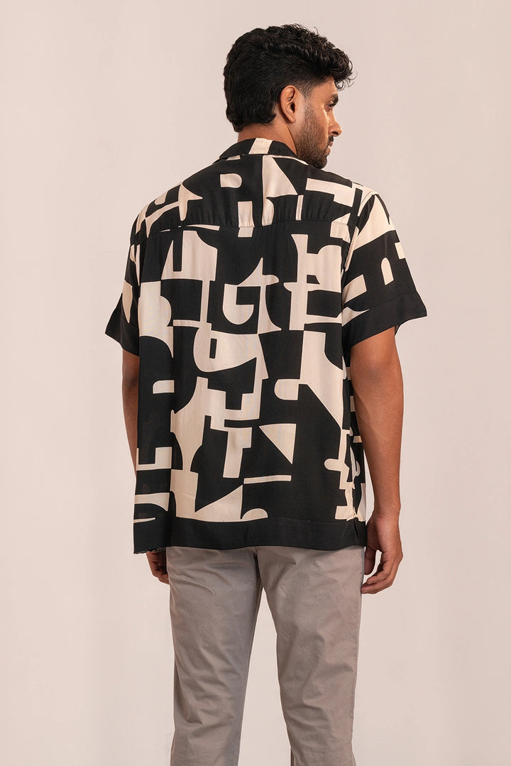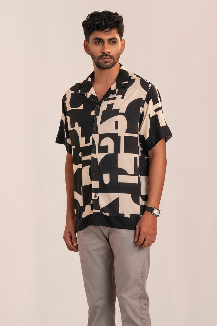 Effortlessly bold, this short-sleeve shirt brings modern art to life through its striking geometric print. Crafted from 100% viscose, it drapes naturally with a lightweight, fluid feel that moves with ease. The relaxed silhouette, camp collar, and soft sheen create a refined yet easygoing look — ideal for warm days, evening gatherings, or vacation escapes.