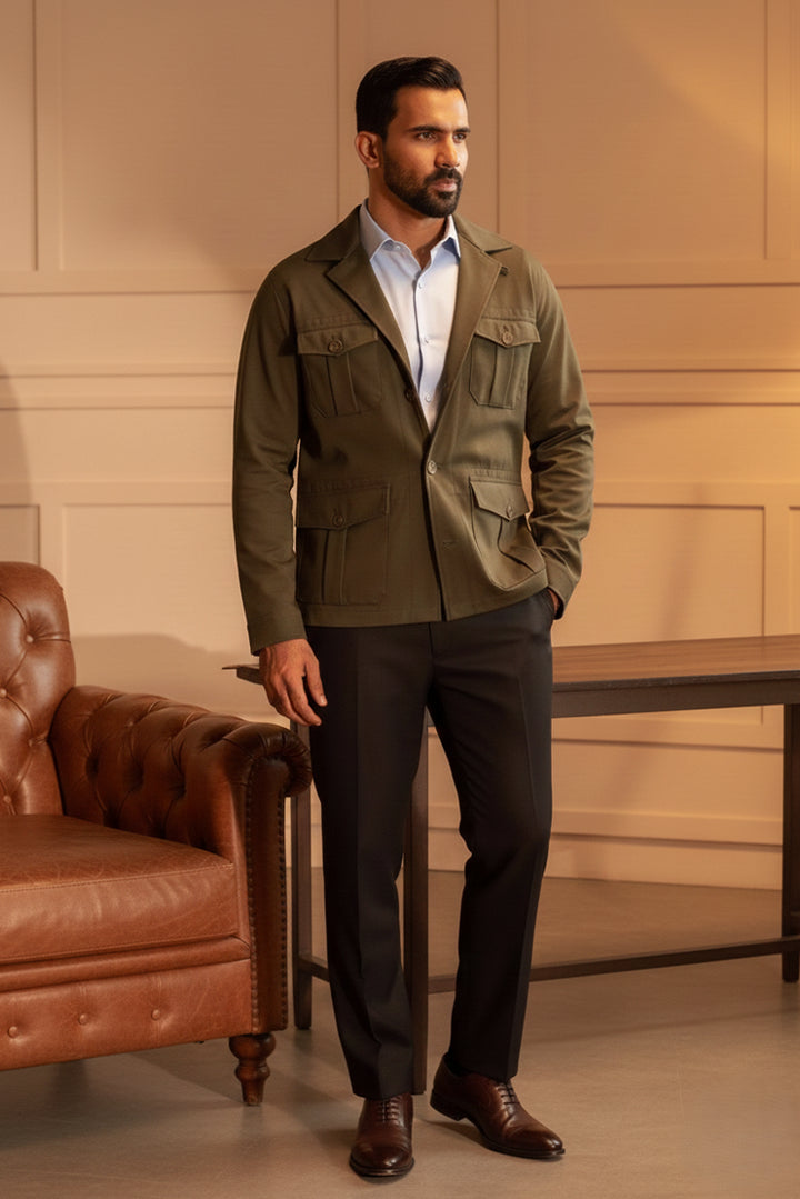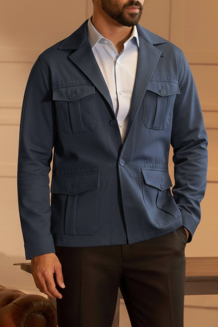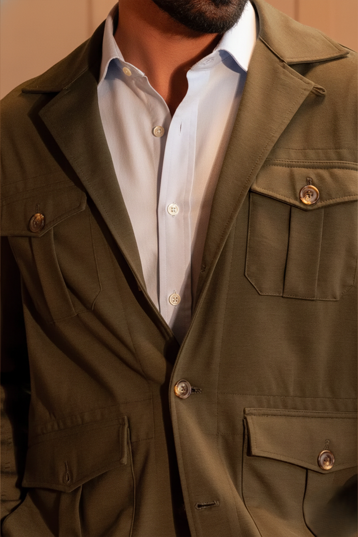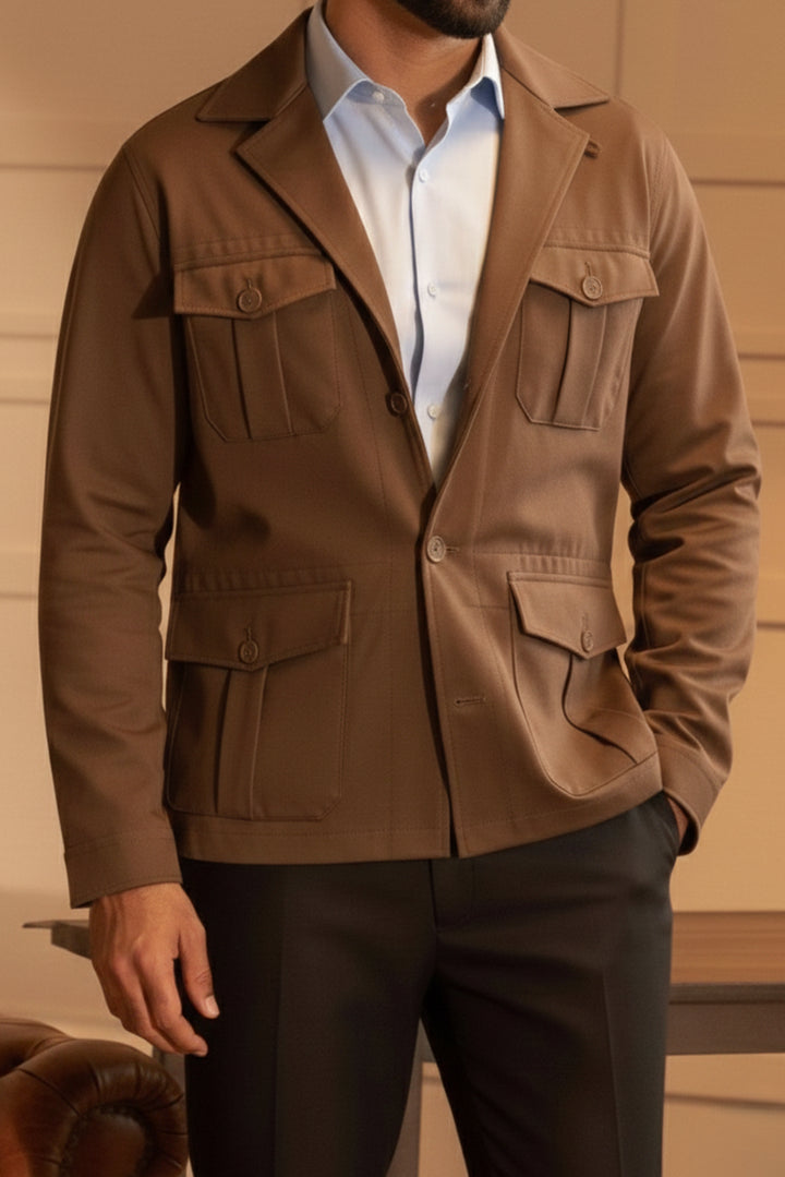 Capture the spirit of exploration and sophistication with The Safari Blazer. This iconic piece is designed for the gentleman who commands style, whether navigating a city street or embarking on an expedition.