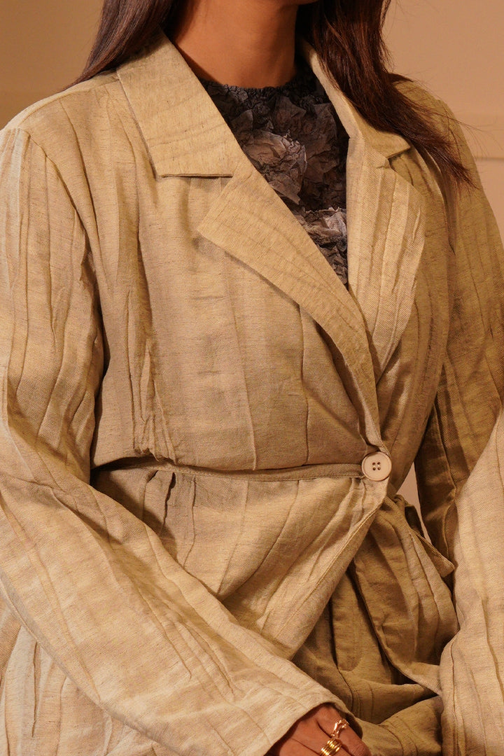 The wrap-style top features a classic lapel collar, subtle button closure, and a self-tie belt that cinches the waist for a flattering fit. Paired with relaxed straight-leg pants, this co-ord set delivers an easy, coordinated look that blends modern elegance with timeless appeal.