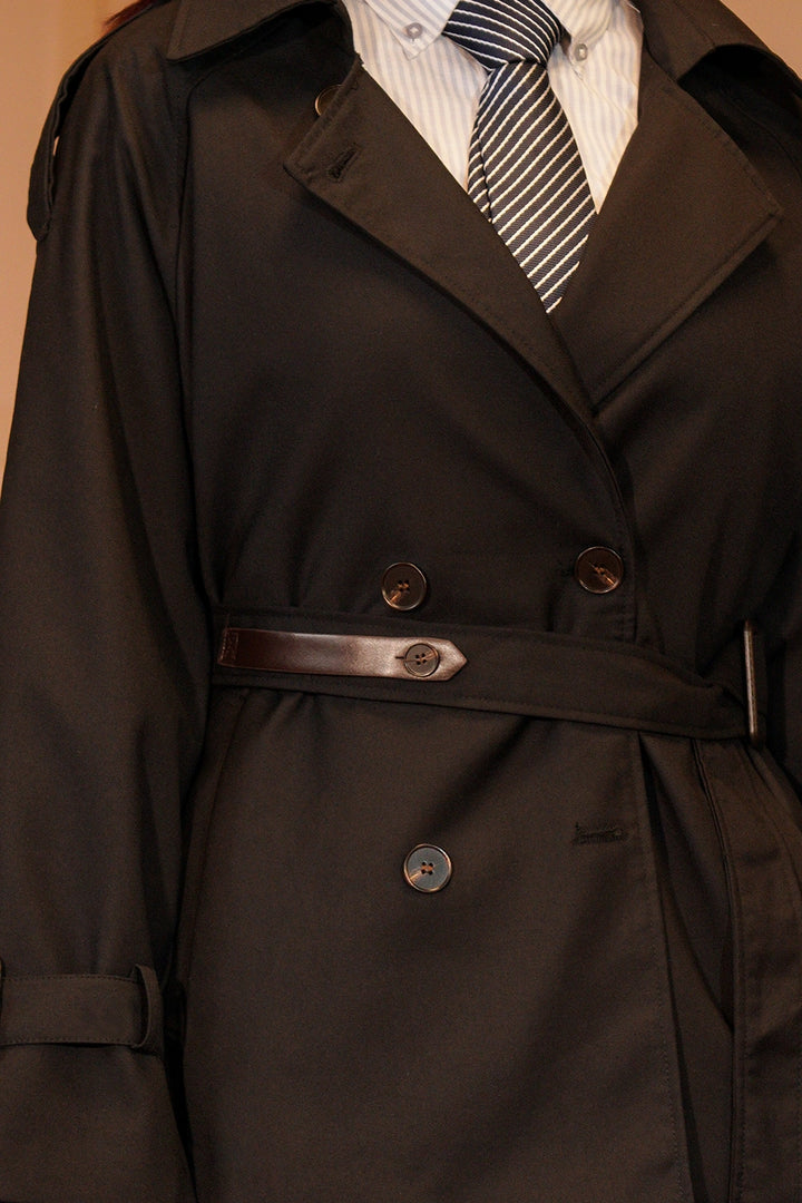 Designed with a double-breasted front and a sleek waist belt, it offers a customizable fit that complements any figure. The buckle-detailed sleeves and refined collar add a touch of authority and style—making it the perfect outerwear for both work and casual occasions.