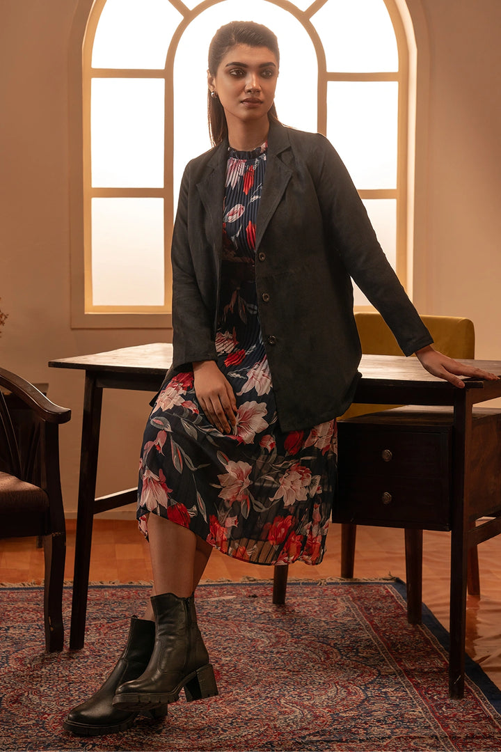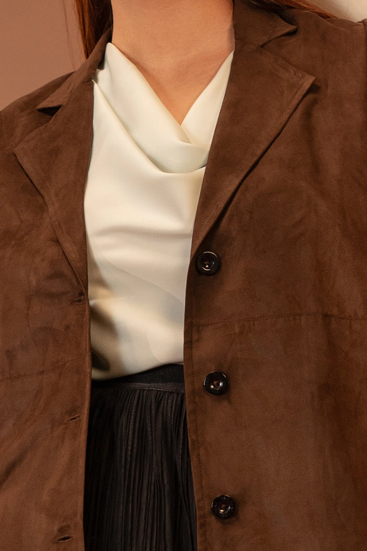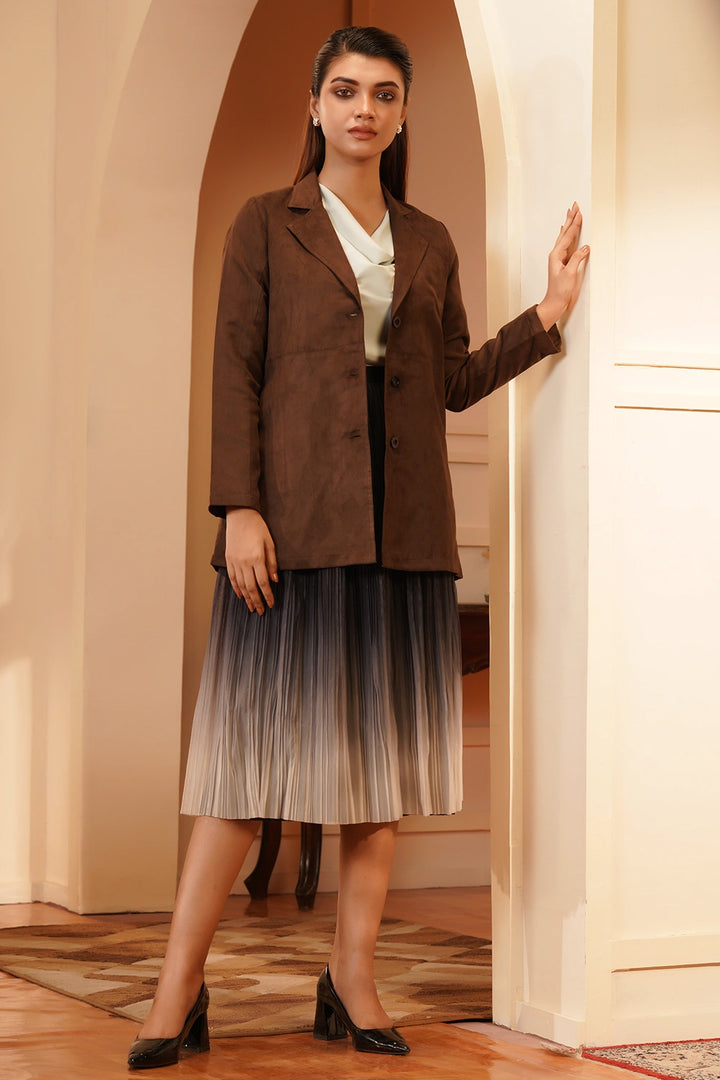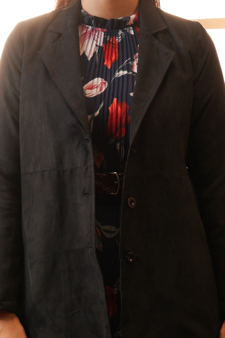 Introducing the Women’s Premium Layered Coat, a timeless blend of sophistication and contemporary style. Crafted with a luxurious suede-like texture, this coat features a refined high-low silhouette that adds dimension and movement to your look. The wide lapel detail enhances its polished appearance, while the full sleeves provide warmth and comfort.