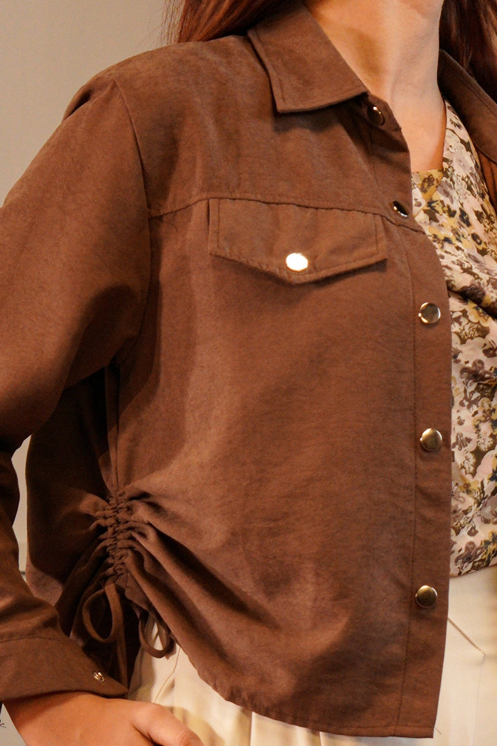 Featuring a classic shirt collar, front snap-button closure, and dual flap pockets, this jacket brings a touch of laid-back sophistication to your everyday style. The relaxed fit ensures easy layering over tops or dresses, making it an ideal pick for transitional weather.